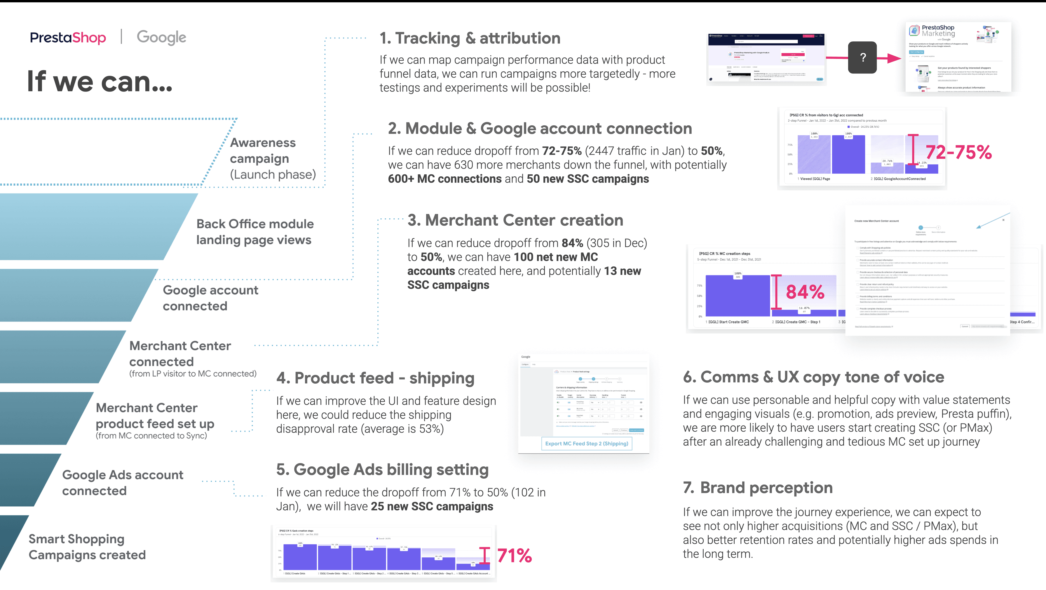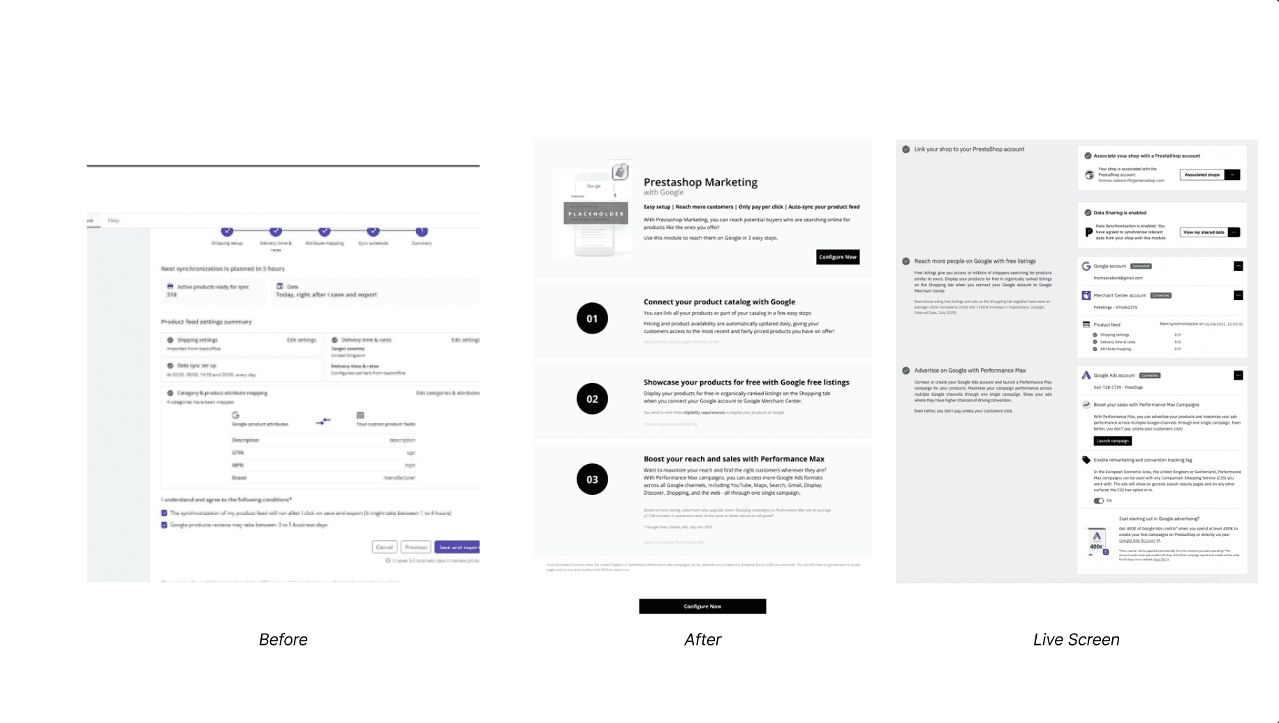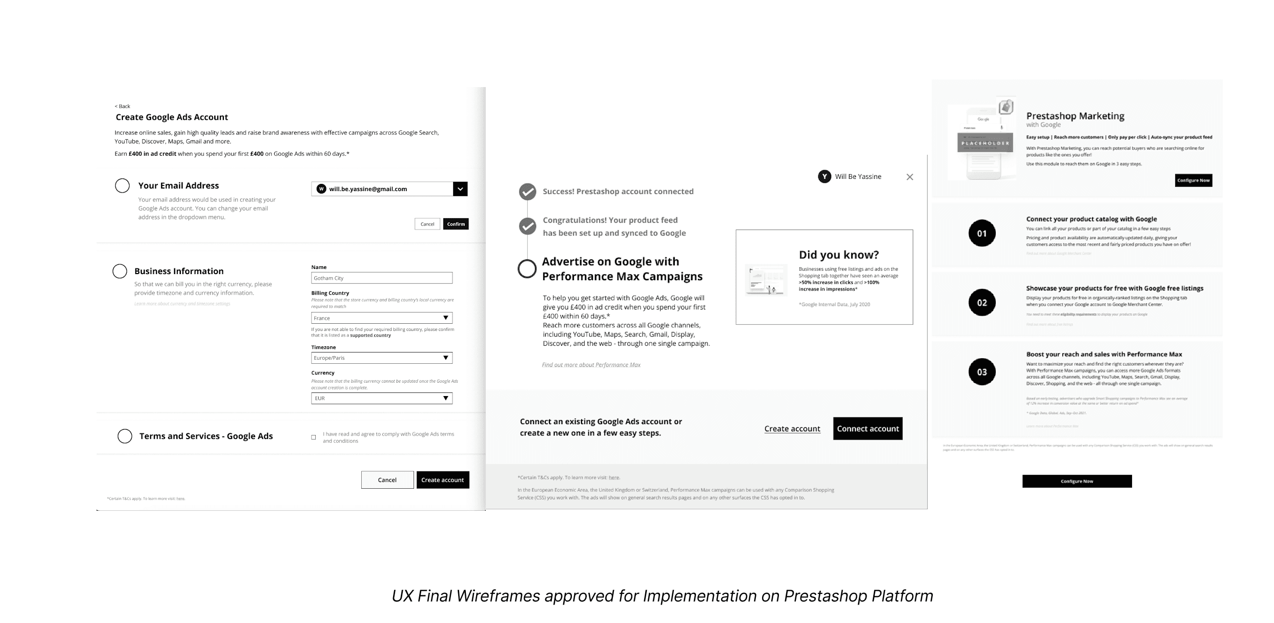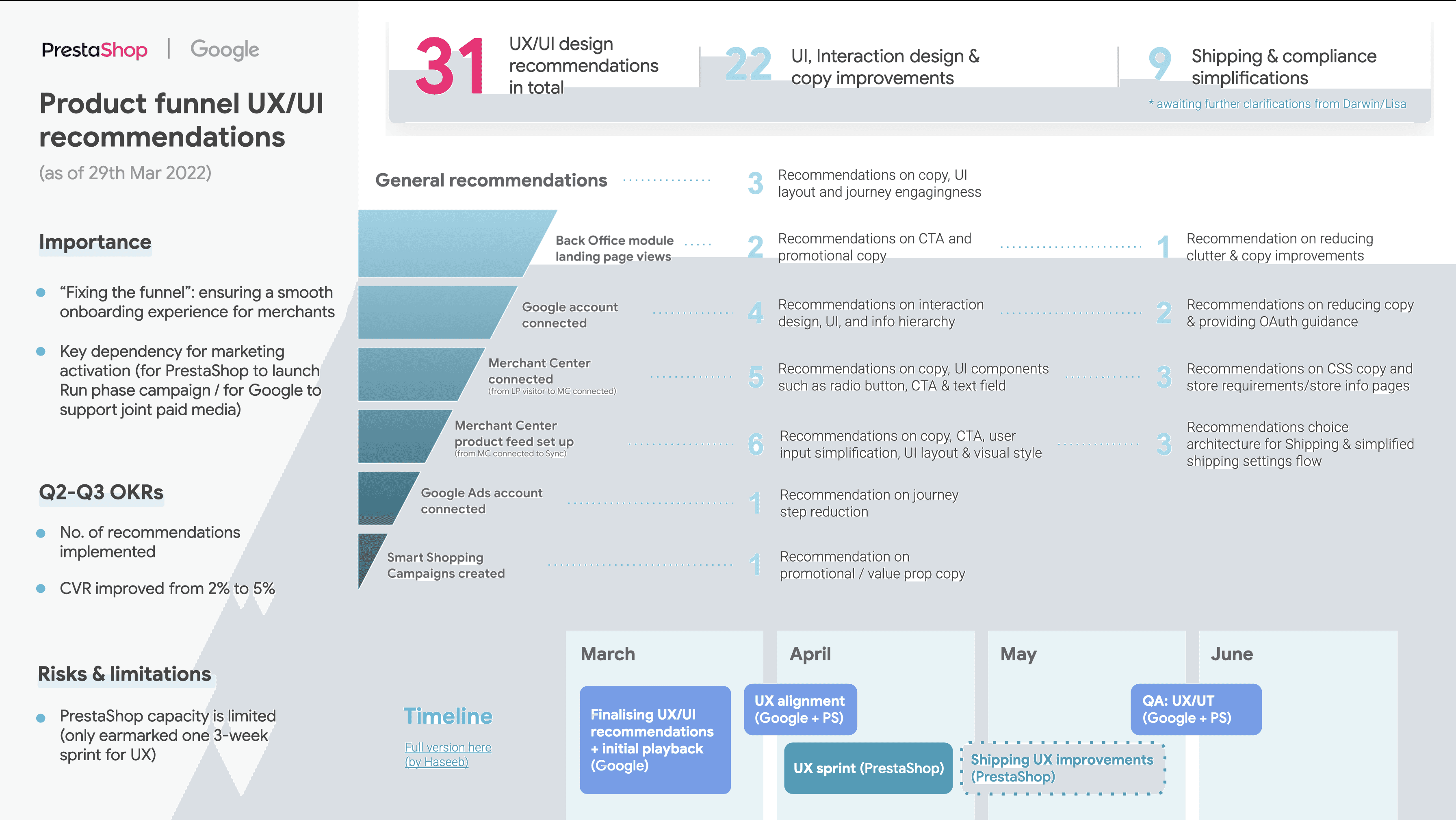 Cross-functional: UX (myself), PMs, Engineering, Legal, Localisation, Prestashop External Dev Team, Google Partnership Marketing