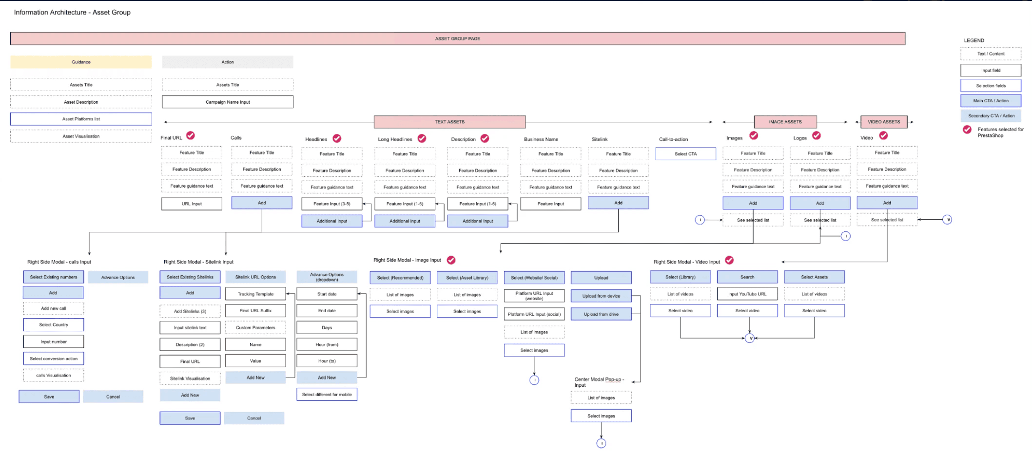 The below screens detail the final UI and interaction for the Google Ads Ad Creation core screens to Prestashop’s design/dev team. These supported implementation with artefacts, annotated hand-offs, and QA reviews.
