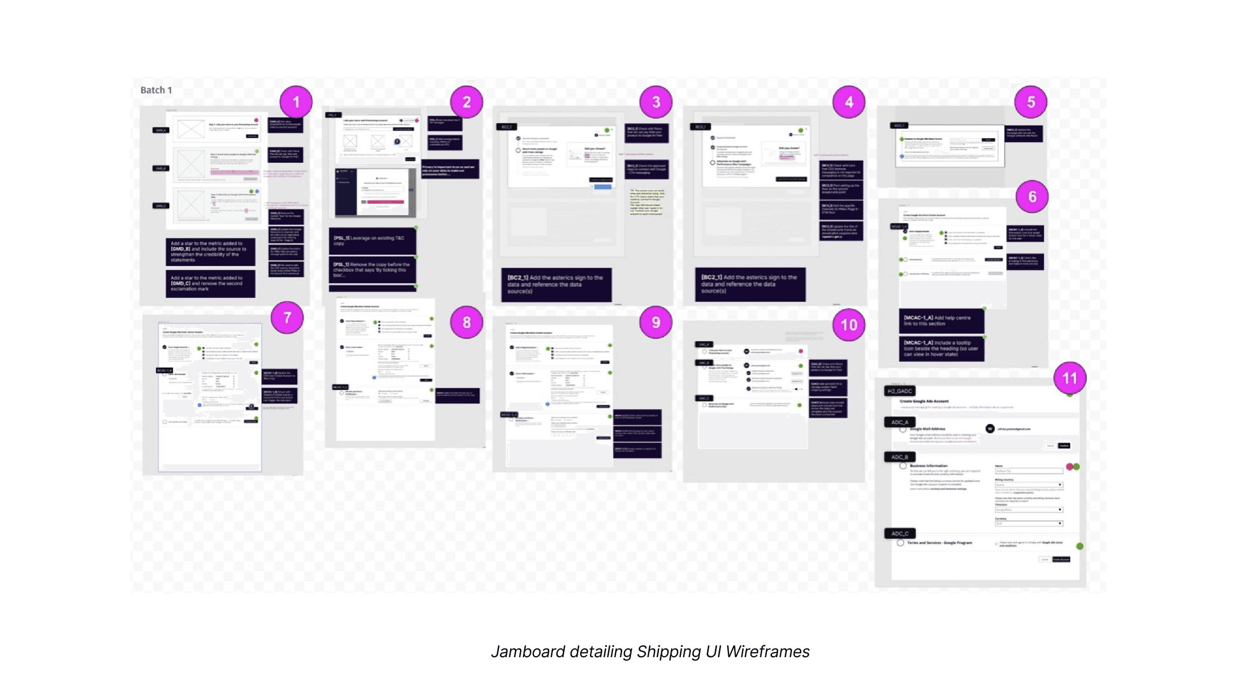 Using Figma, wireframes were designed and prototyped exploring key areas ranging from campaign creation to Google Ads account creation as well as the Shipping UI flow. All these implemented the 3-Step 2 panel framework that was assembled using a modular design system to ensure scalability across board and future proofing the solution such that it can be replicated on other 3P partner platforms and can be used after the Smart Shopping Ads transitioned to Performance Max Ads (PMax)
