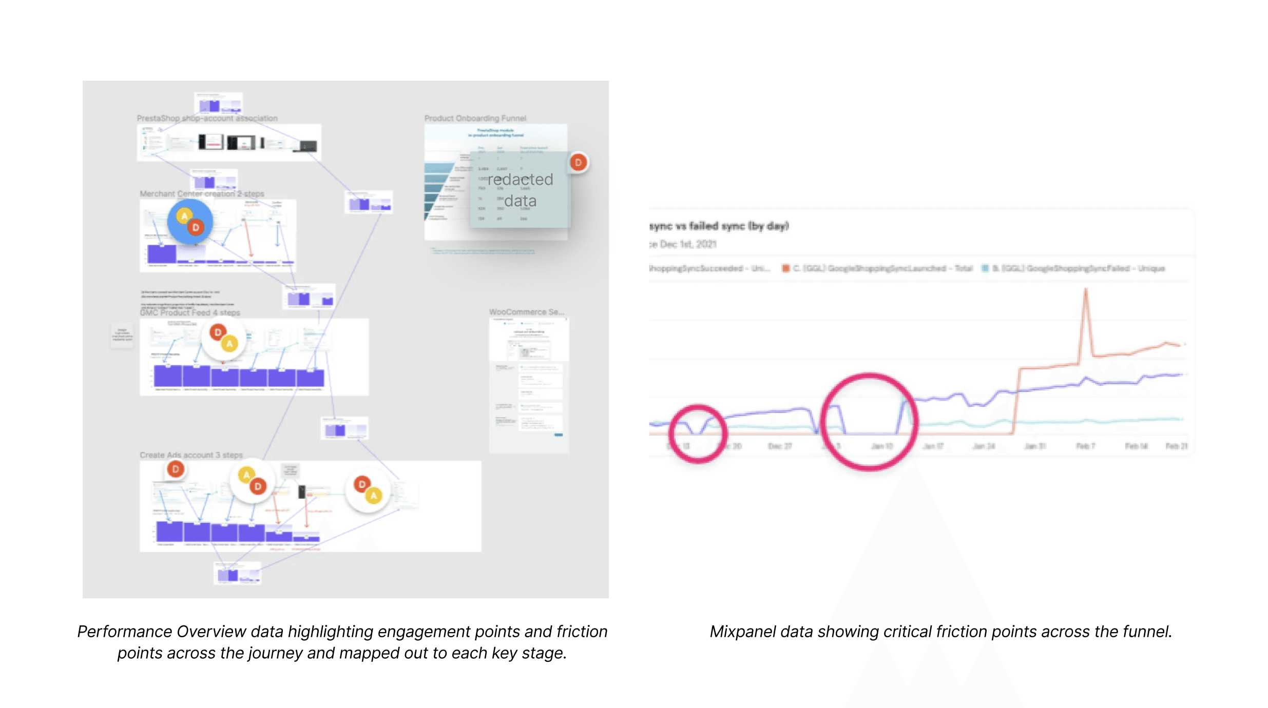 The following discoveries were made following the analysis and sythesis of data from Mixpanel, Customer Support Tickets, Social Listening and user surveys. * 16% of users completed campaign setup * 54% dropped off before reaching budget settings Identified UX bottlenecks: unclear CTAs, poor localisation, shipping info buried in multiple screens, and mismatched Google visual semantics.