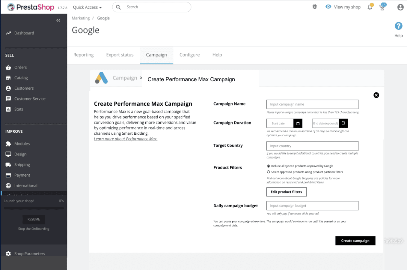 The Google Ads Prestashop Integration is a 3rd party e-commerce module that allows SMBs to launch campaigns via Google Ads directly from their Prestashop dashboard.